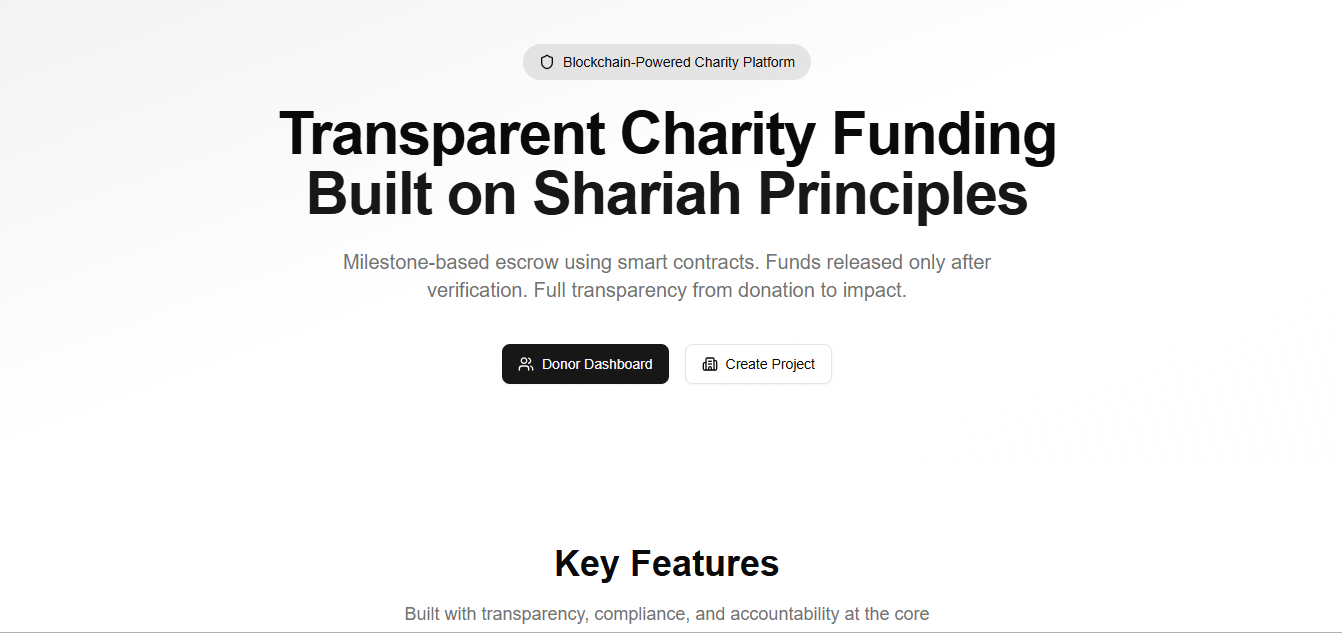 Milestone-based charity and crowdfunding platform with transparent fund tracking and Shariah-compliant escrow smart contracts. Built with Next.js, Solidity, libSQL/Turso, and Web3 integrations.